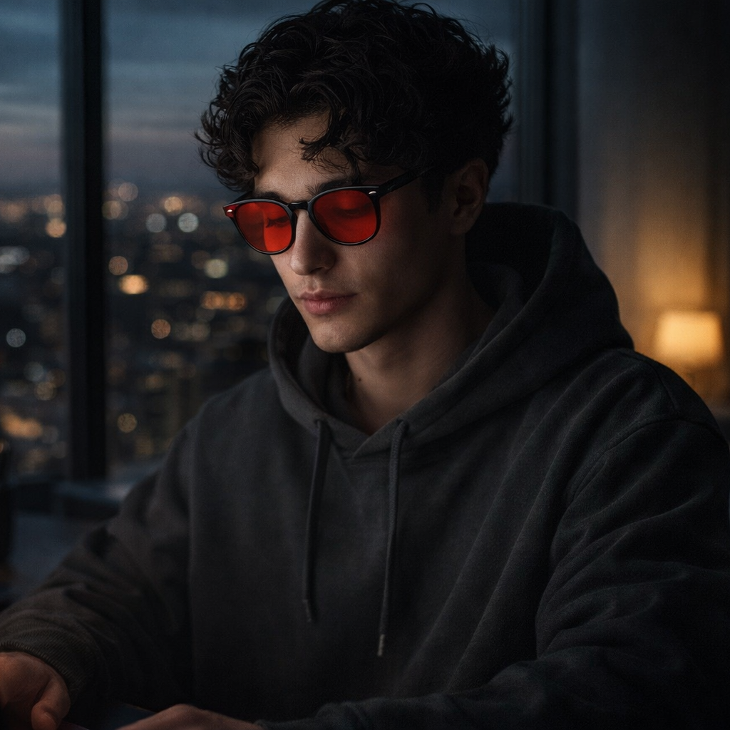 Premium after-dark glasses designed to make late-night screen time feel less harsh and more like night again.